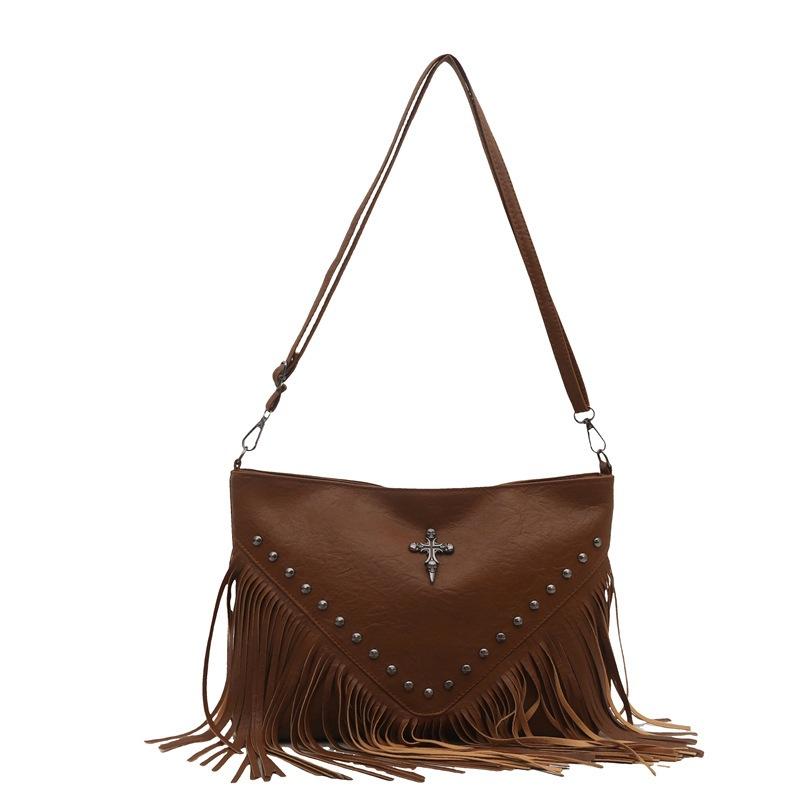 Сумка большой вместимости женская летняя новая модная ретро на плечо сумка-мессенджер с заклепками и бахромой коричневый