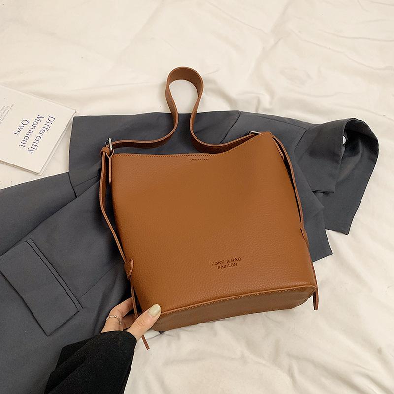 Сумка-ведро женская 2024 осень новая модная простая большая вместительная сумка через плечо однотонная популярная иностранная сумка-мессенджер коричневый