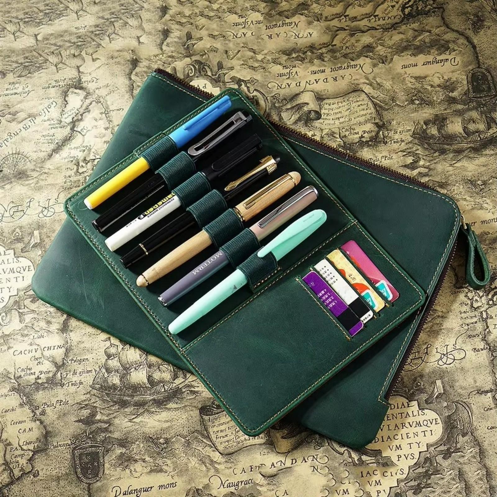 Сумка для ручек из натуральной кожи на молнии, портфель формата А5, большая вместимость с карманом для ручек и держателем для карт, сумка для канцелярских принадлежностей в стиле ретро для школы и офиса