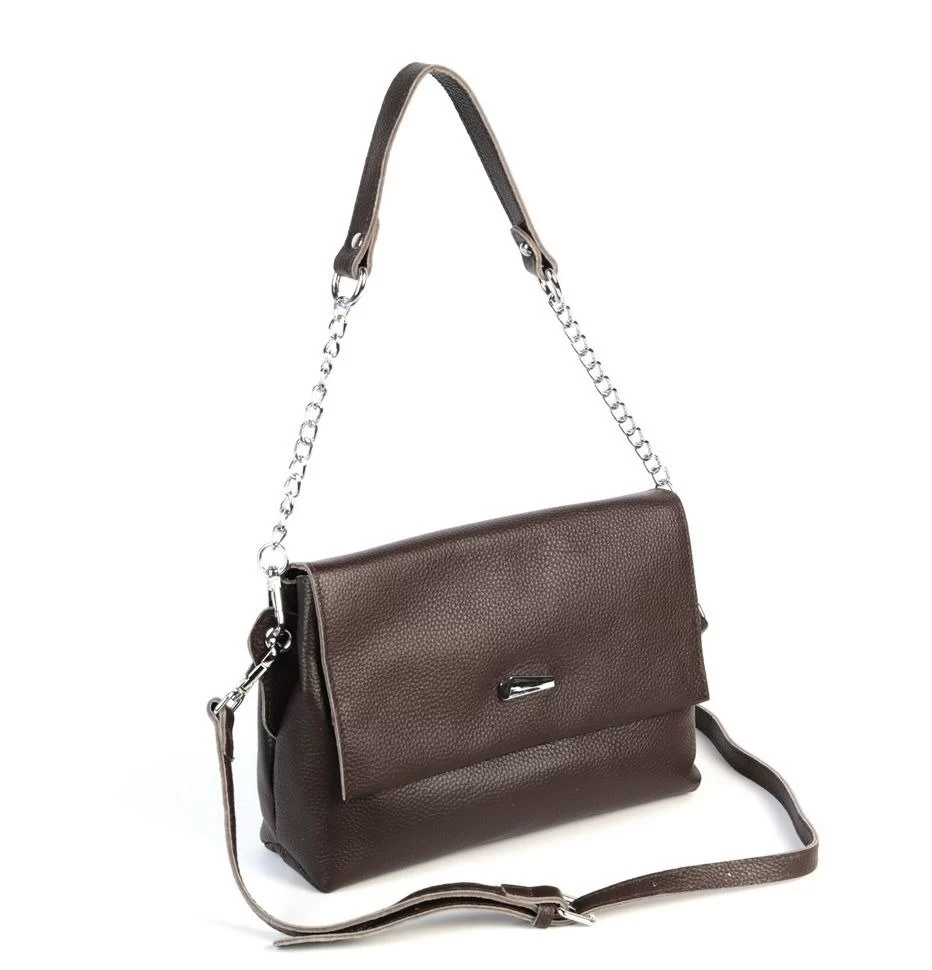 Женская сумка из натуральной матовой кожи коричневого цвета. Закрывается на клапан с магнитной кнопкой. Внутри два отделения на молниях и есть боковые кармашки, один на молнии и один открытый. Снаружи, на обратной стороне карман на кнопке. В комплекте короткий ремешок с цепочкой, длиной 60 см., и регулируемый по длине наплечный ремень, с максимальной длиной 120 см.