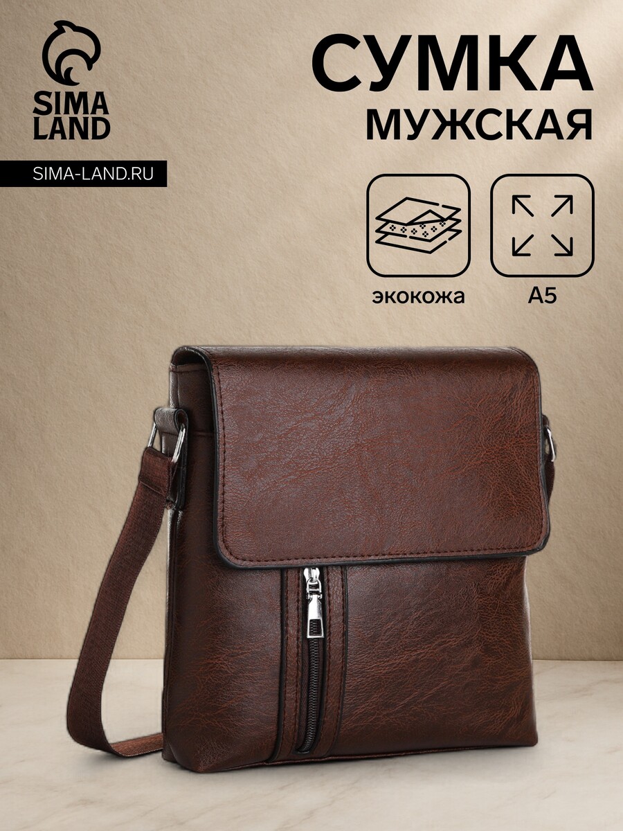 Сумка планшет мужская на молнии, 2 наружных кармана, коричневая, Коричневый
