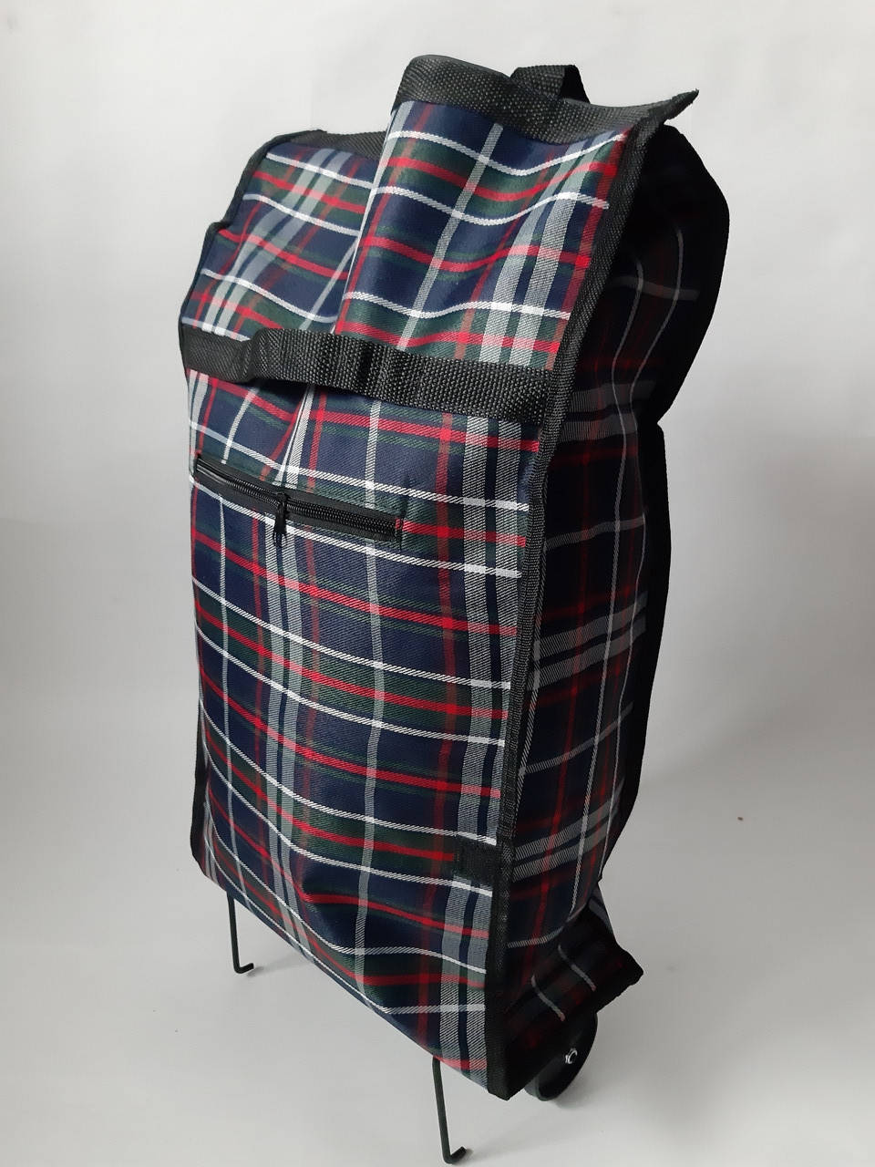 Ручная хозяйственная сумка на колесах, при необходимости колеса складываются внутреннею часть и фиксируются, имеются две металлические подпорки. Сумка изготовлена из прочного водонепроницаемого материала пропилена внутри имеются металлические направляющие сохраняющие форму сумки, сумка на липучке снабжена удобным дополнительным карманам в передней части, достаточна объемная легко выдерживает нагрузку до 10 кг.