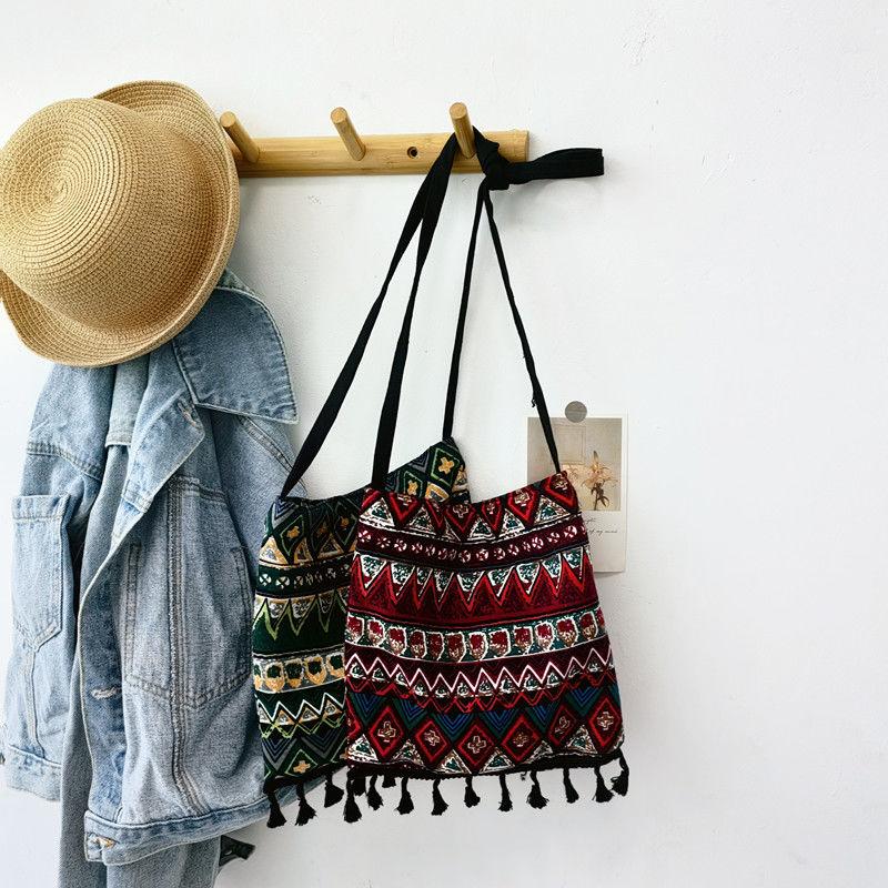Сумка через плечо в этническом стиле с кисточками, ретро-художественная маленькая сумка через плечо, тканевая сумка в богемном стиле
