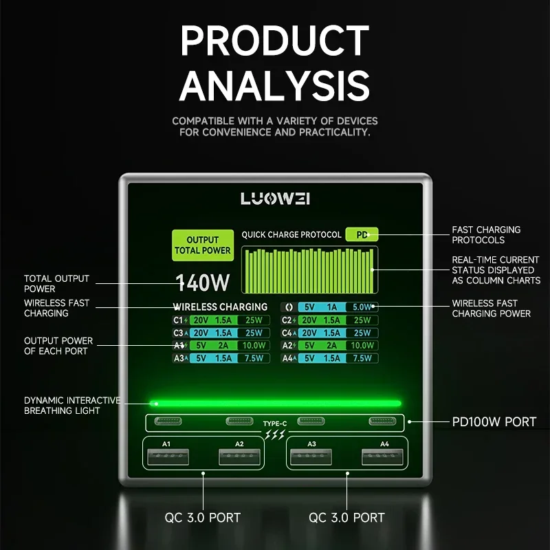Супербыстрая зарядка с максимальным выходом Luowei 140 Вт, поддержка протокола PD3.0, беспроводное зарядное устройство для быстрой зарядки телефона, зарядная станция USB