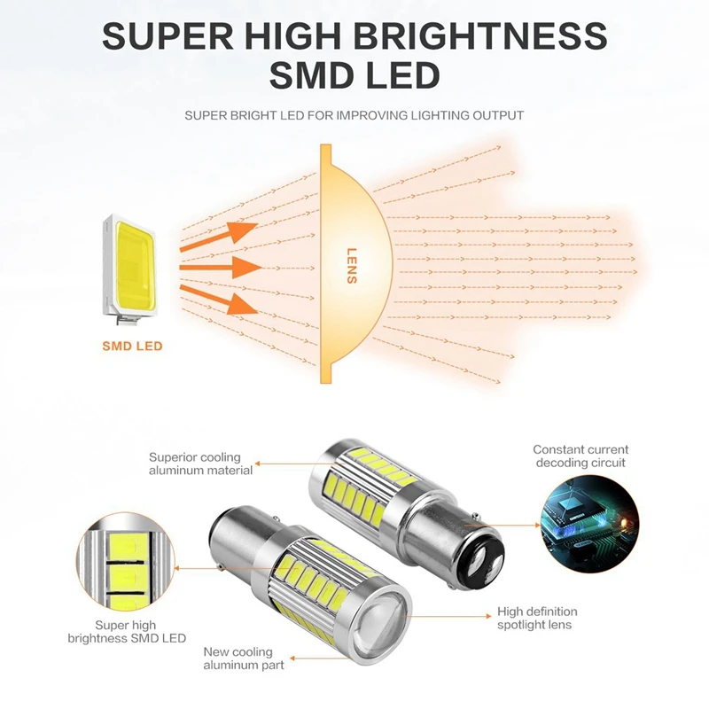 Суперъяркая лампочка, Φ 1157, лампочка P21/5W, BAY15D, лампочки с чипами 33SMD 5730, Ксеноновые белые (комплект из 12 шт.)
