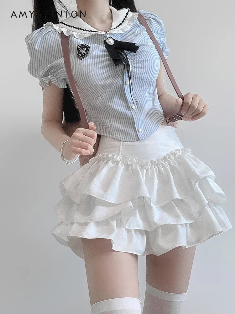 American Spice Girl Sweet JK Uniform Set Navy Collar Striped Short Sleeve Shirt High Waist Multi-layer Cake Skirt Two-piece Set