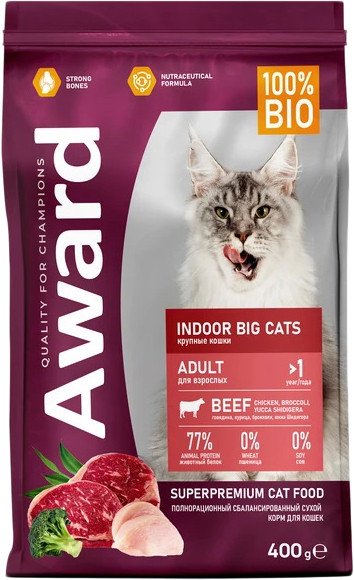 Сухой корм для кошек Award Adult Indoor Big Сats (для крупных пород с говядиной и курицей с добавлением брокколи и Юкки Шидигера) 400 г
