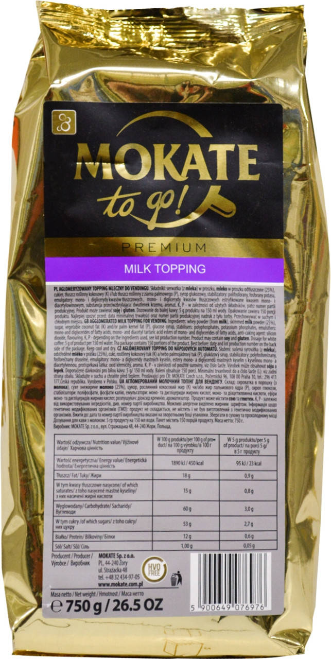 Сливки MOKATE TOPPING PREMIUM – это гранулированные сливки для использования в кофейном оборудовании, придают кофе насыщенный молочный вкус и создают устойчивую пышную пенку. Являются лидером продаж. Сливки не слипаются и не коксуются. Вендинг-операторы используют сливки данной марки, поскольку они великолепно сочетаются с любым кофейным напитком и отличаются прекрасной растворимостью и пенообразованием. Рекомендуемая дозировка: 3-5 гр./150 мл.