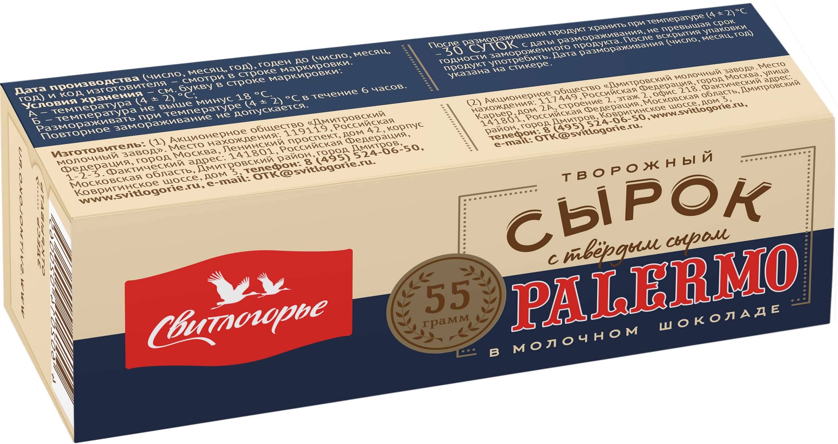 Срок годности в днях: 30Состав: творог (молоко цельное, молоко восстановленное из сухого молока, масло сливочное, закваска, молокосвёртывающий ферментный препарат), сахар белый, шоколад молочный (сахар, какао-масло, молоко сухое цельное, какао тертое, эмульгатор: соевый лицетин, ароматизатор натуральный-ваниль), сыр твердый «Палермо» (молоко нормализованное пастеризованное, соль пищевая, закваска культур молочнокислых микроорганизмов, молокосвёртывающий ферментный препарат микробного происхождения, уплотнитель – хлорид кальция), масло сливочное.Пищевая ценность: Калорийность: 395Белки: 10Жиры: 26Углеводы: 31Страна изготовления: РоссияПроизводитель: Свитлогорье
