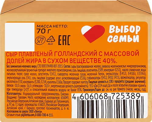 Сыр плавленый Выбор семьи Голландский 40% БЗМЖ 70 г
