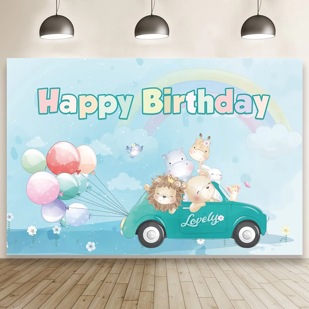 С Днем Рождения мультфильм Животные вечерние ринка дети портрет фотография Фон Радуга воздушные шары Декор семья фотосессия фон