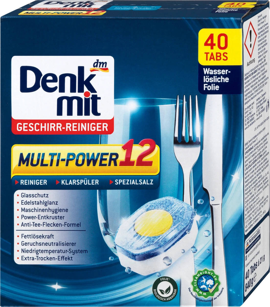Блискуча чистота та блиск вашого посуду з брендом Denkmit! Таблетки для посудомийної машини Multi-Power 12 від Denkmit ефективно видаляють засохлі залишки їжі, жир та інші домішки з вашого посуду та столових приладів. Таблетки містять очищуючу, полірувальну речовину, спеціальну сіль і функцію захисту скла. Таблетки забезпечують ідеальний результат, сяючий чистий посуд без плям і вапняного нальоту, захист посудомийної машини та нейтралізацію запахів. Оптимальний результат від 40 °C. Denkmit Multi-Power 12 таблеток для посудомийної машини - для ідеальної чистоти та блискучого блиску!