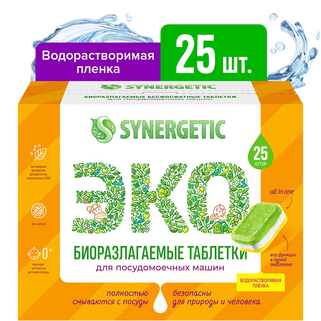 Таблетки для посудомоечной машины Synergetic биоразлагаемые, бесфосфатные, в водорастворимой пленке, без запаха (25 шт)