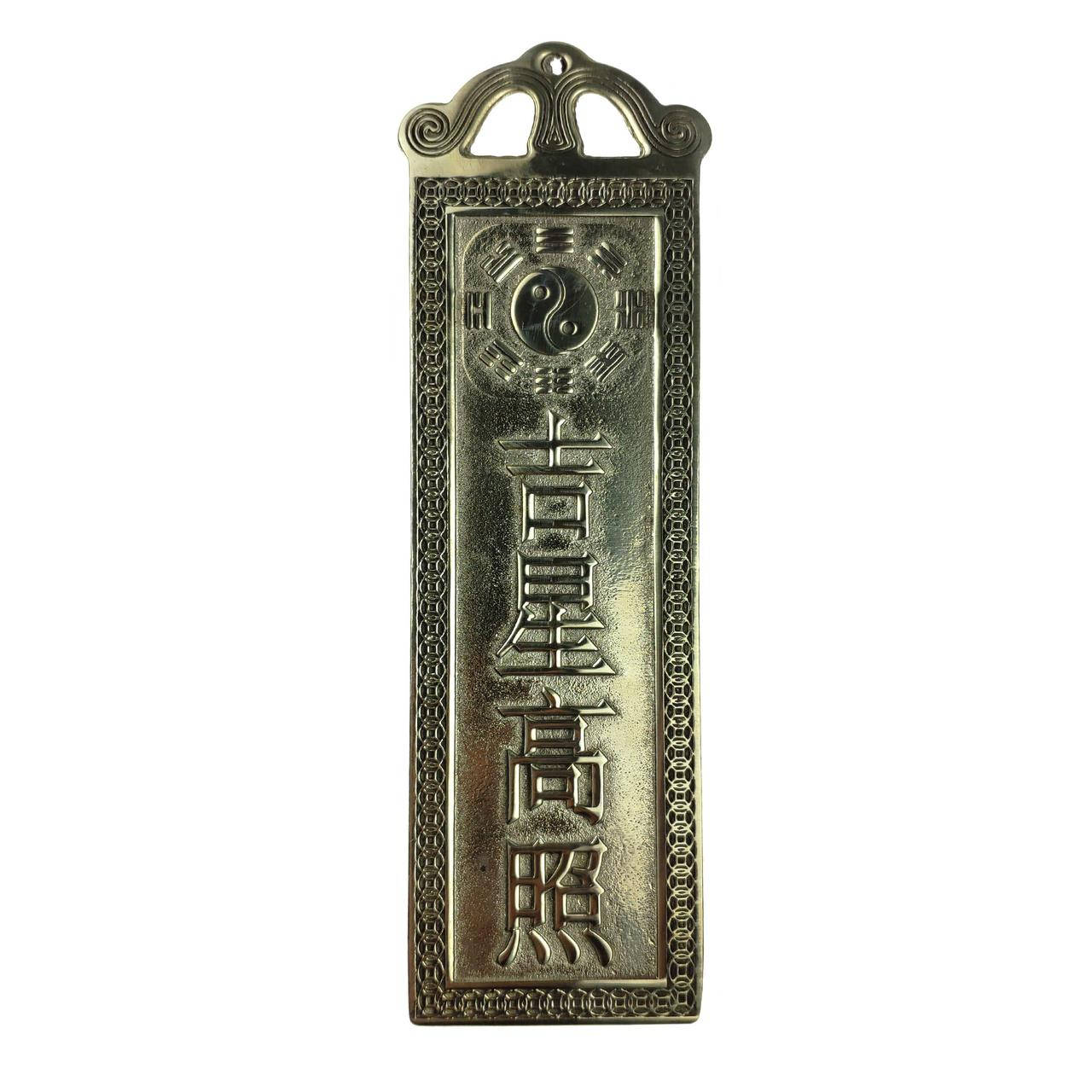 Пластина из латуни с изображением Инь Ян, Ба гуа и китайских монет. На пластинах написан следующий текст: "Пусть неизменно сопутствует удача!". Пластина двухсторонняя. Таблицу с иероглифами счастья можно повесить и с наружной стороны двери.