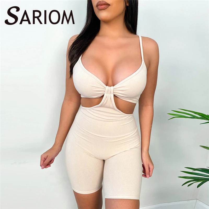 Hollow Cut Out Skinny Romper Shorts Ribbed Sleeveless Workout Spaghetti Strap Sexy Womens Playsuit Summer Combinaison Ete Femme