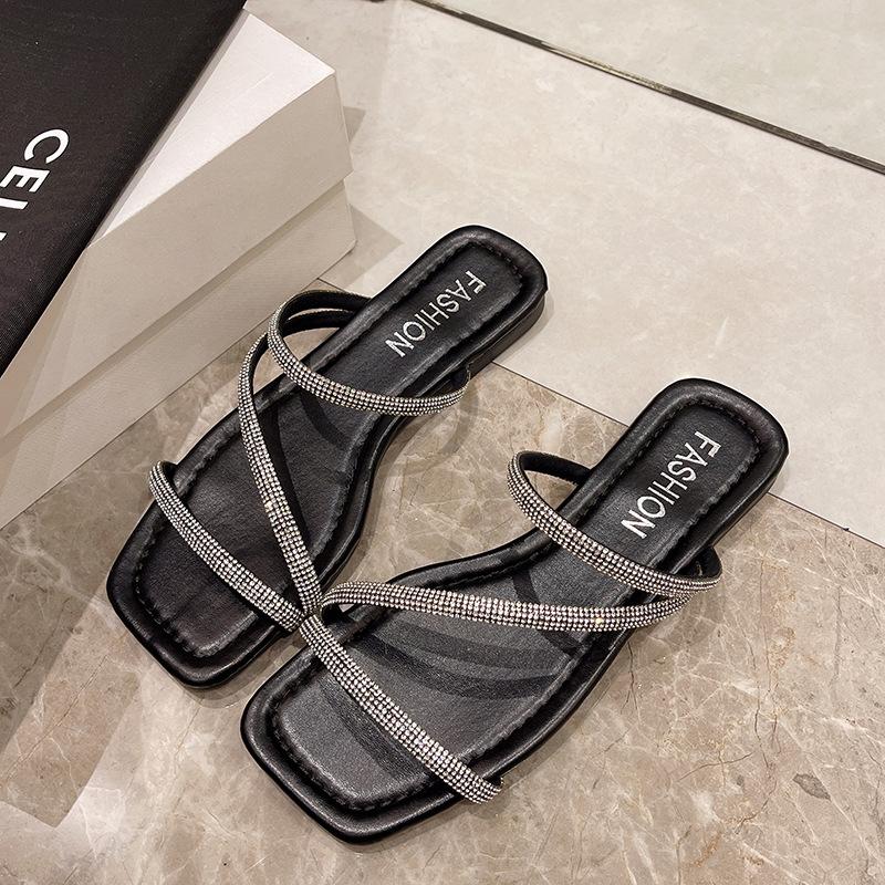 Тапочки женские летние для улицы Новогодние модные универсальные со стразами на плоской подошве пляжные прохладные тапочки 35 чёрный