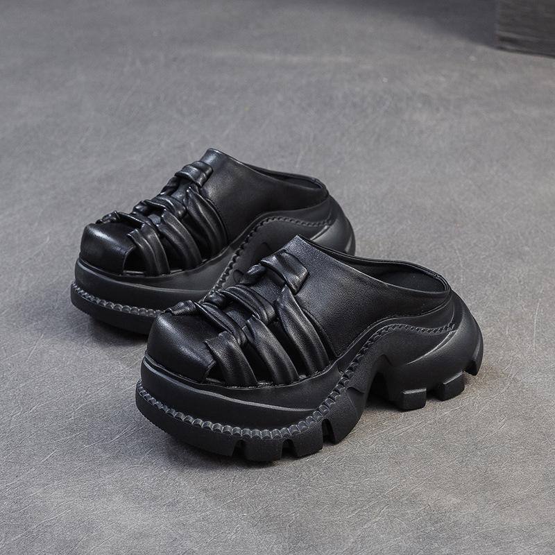 Тапочки из натуральной кожи Johnature Retro, увеличивающие рост, легкие женские туфли на платформе с вырезами 40 чёрный