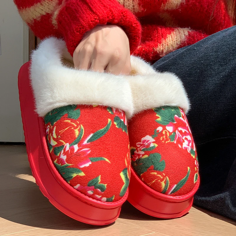 Тапочки на платформе с цветочным принтом в стиле ретро, женские теплые домашние тапочки на плюшевой подкладке, нескользящая домашняя обувь на толстой подошве