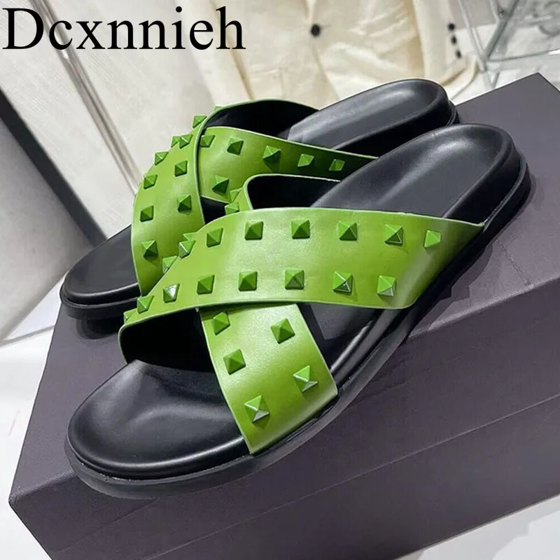 Тапочки унисекс с круглым носком, повседневные туфли с заклепками, без каблука, с круглым носком, для отдыха, лето