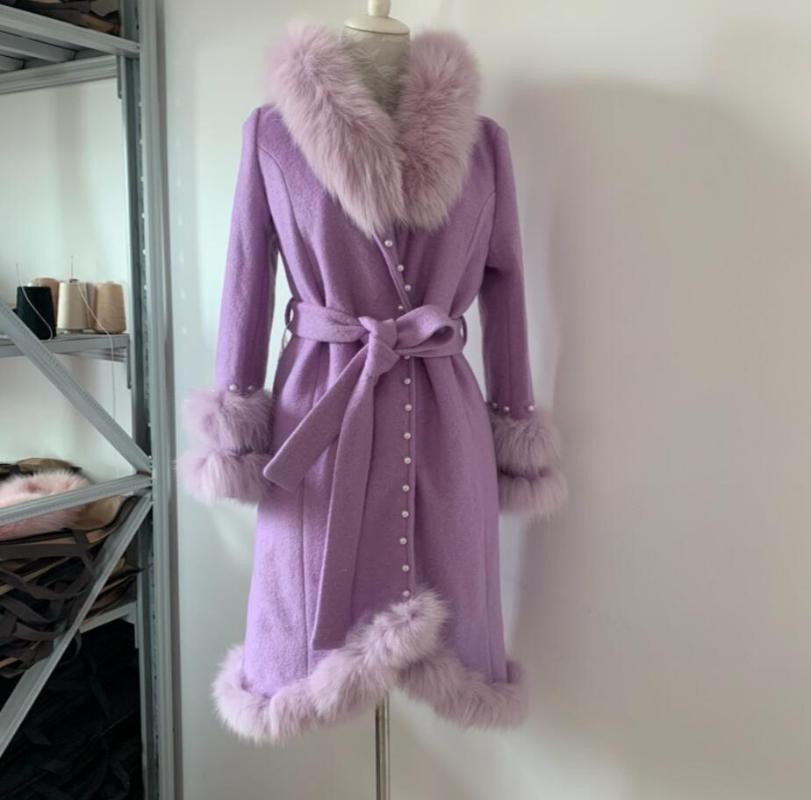 New fashion women diamond beading wool blends coat fur collar cashmere coat female slim belted woolen q576