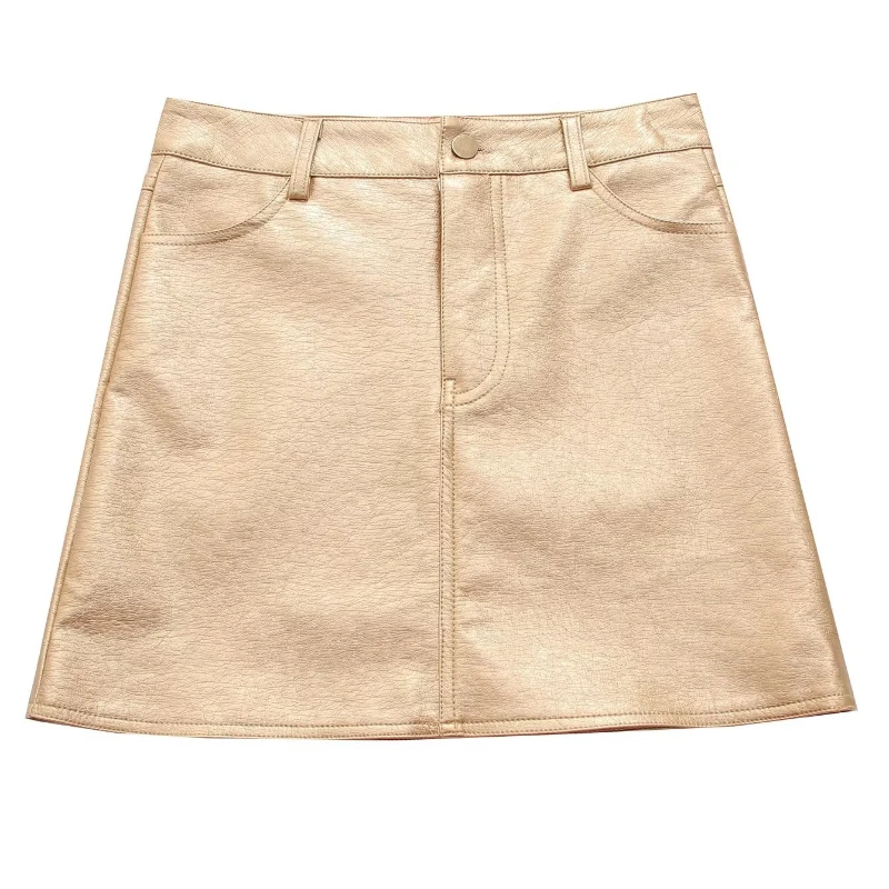 Текстурированные золотистые кожаные короткие юбки с карманами матовые металлические серебристые мини-юбки из искусственной кожи