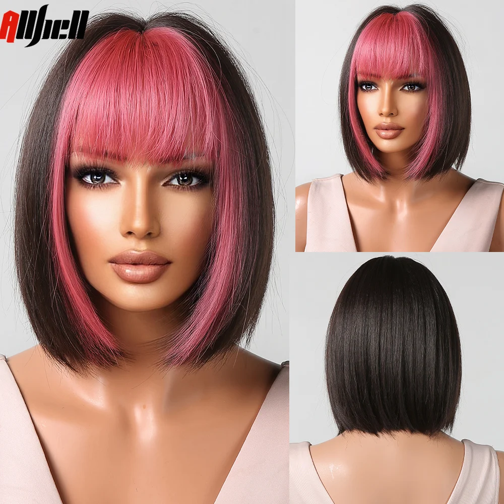 Темные коричневые короткие прямые синтетические парики боб розовые прямые волосы с пушистой челкой для женщин Косплей ежедневная Лолита термостойкие