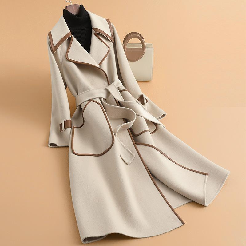Темпераментное шерстяное пальто большого размера осень-зима новое свободное длинное с поясом двустороннее шерстяное пальто L (recommended about 141-80kg)
