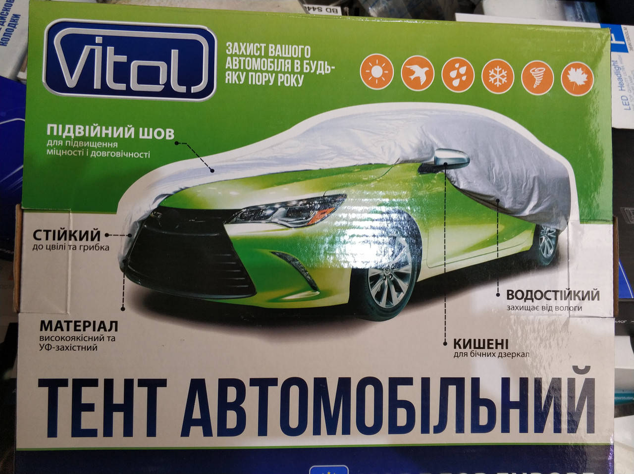 тент автомобильный Vitol отлично защищает автомобиль от негативного воздействия окружающей среды в виде осадков, жаркого солнца,пыли. Изготовлен из прочного водоотталкивающего материала. Предотвращает образования царапин на покрытии автомобиля. В нашем интерне - магазине Вы можете приобрести тенты следующих размеров: