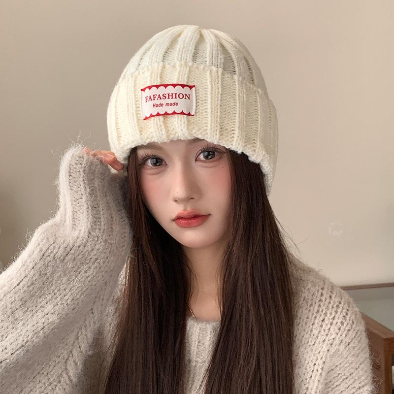 Теплая и защищающая уши вязаная шапка в корейском стиле, простая шапка-пуловер с тканевой этикеткой, уличная, для поездок на работу, облегающая лицо, маленькая шерстяная шапка для женщин