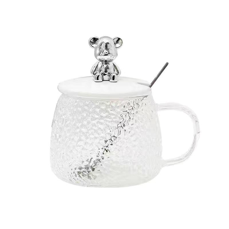 Теплая чашка из декоративного стекла с медведем | Рельефная чашка с узором «молоток» с ручкой, крышкой и ложкой 201-300ml