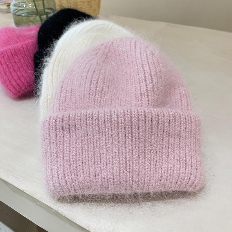 Теплая шапка из меха ангорского кролика для женщин, мягкая толстая женская зимняя вязаная шапка, модная широкая манжета, однотонная, русская лыжная брендовая шапка