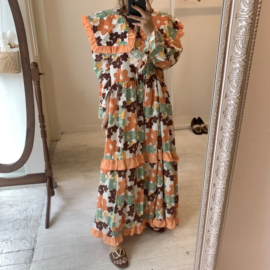 SuperAen 2021, новинка, прерии, шик, Питер Пэн, воротник, принт, оборки, длина по щиколотку, трапециевидные платья для женщин