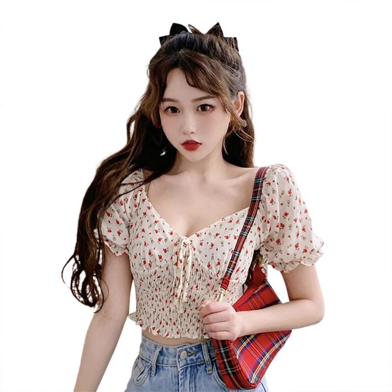 Women Summer Stylish Wrinkled Puff Sleeve Floral V Neck Waist Tight Crop Top Summer Holiday Flroal Print Tops Elegant Tops Women, Black