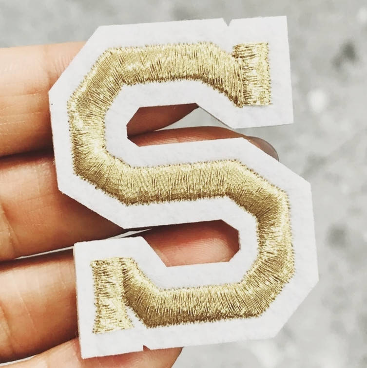 Термоаппликация буква S для одежды, на клеевой основе. Материал белый фетр с вышивкой из золотистых ниток. Приклеивается к одежде при помощи утюга.
