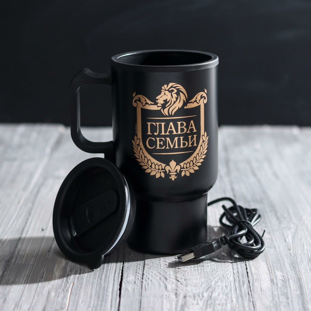Термокружка с USB «Глава семьи», 450 мл, сохраняет тепло 2 ч. Термокружка с подогревом от USB — незаменимая вещь для тех, кто проводит свой день за компьютером или в дороге. Особенности: –Термокружка предназначена для поддержания температуры горячих напитков, без функции кипячения (максимальная температура нагрева 70-80 градусов). –Подключается при помощи провода к USB-разъему компьютера, ноутбука или автомобиля (напряжение 12 В). –Зауженное прорезиненное дно диаметром 70 мм обеспечивает устойчивость емкости на любых поверхностях и соответствует размеру автомобильного подстаканника. –Крышка позволяет пить в дороге. В ней имеется небольшое отверстие, которое оснащено пластиковой задвижкой (отверстие для питья). Это исключает выплескивание жидкости и позволяет использовать ее во время пеших прогулок или поездке в автомобиле. При желании Вы можете снять крышку.