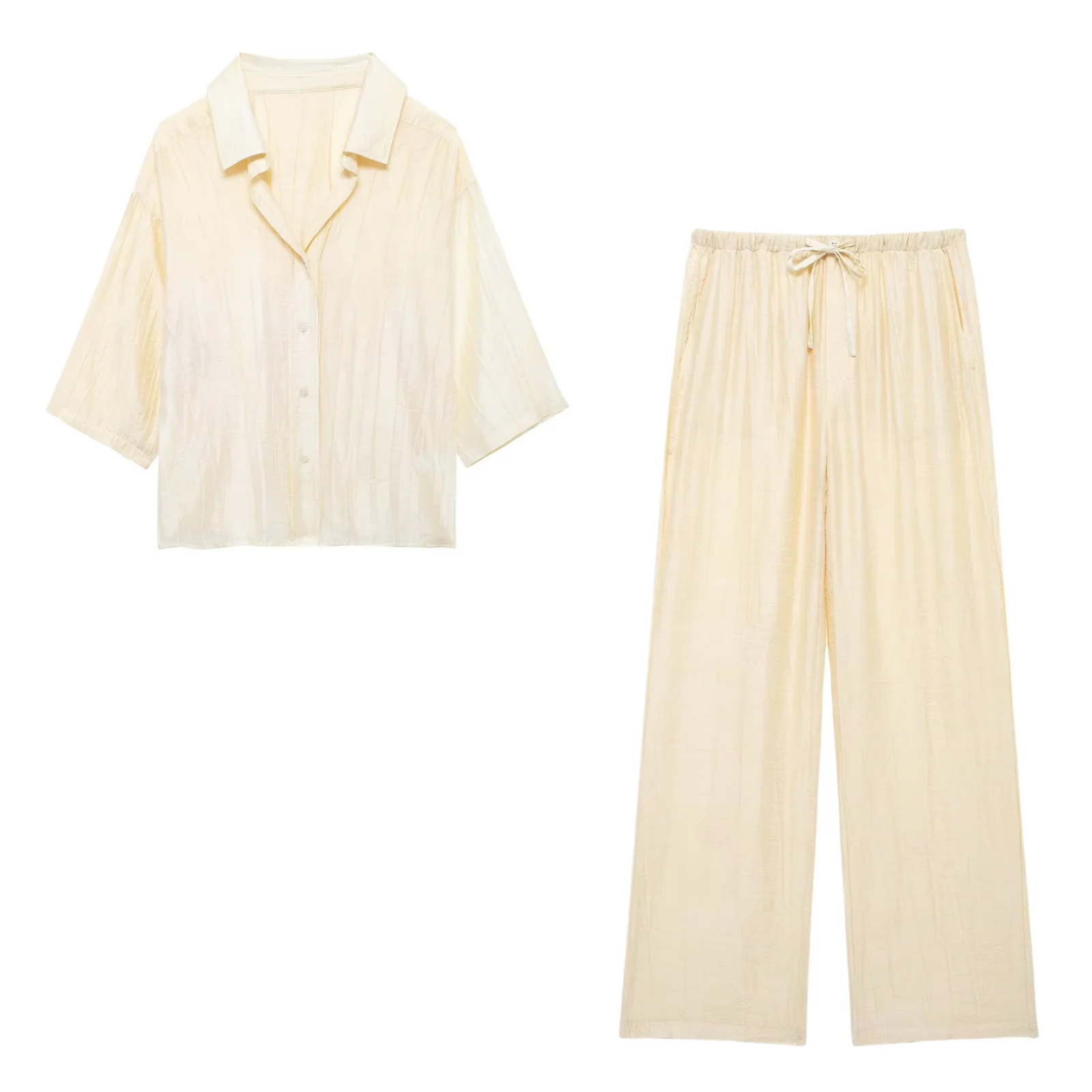 PB&ZA2025 Summer New Arrivals Women's Casual Chic Loose Shirt Top + Elastic Waist Drawstring Wide Leg Pants Set