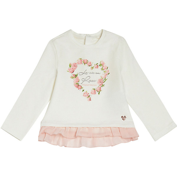 Толстовка легко надевается благодаря удобным кнопкам на спинке. Обладает эластичными свойствами. Украшена принтом, есть металлическая нашивка с логотипом бренда. По низу отделана контрастными оборками. Натуральная ткань в составе обеспечивает хороший воздухообмен.