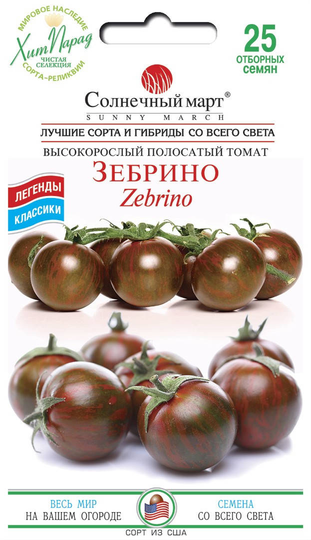 Zebrino имеет неповторимый внешний вид привлекательных плодов с глубоким рубиново-красным цветом, разрисованных, как мазками кисти художника, темно-зелеными полосами. Их окраска меняется от темно-зеленого до темно-коричнево-красного с зелеными полосами тигра при полном созревании. Индетерминантный (высотой 1,8 м) сорт среднего сезона, 80-85 дней от пересадки. Это красивые крупные черри с размером плодов от 30 до 40 г (1-1,5 унции) с отличным сладким вкусом и прочной мясистой текстурой глубокого красного цвета, сочные и исключительно богатые томатными ароматами, которые содержат намеки на дым и сладость.