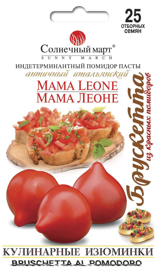 Красивые и блестящие, эти помидоры, когда они нарезаны, как будто оживают, переливаясь глубоким красивым красным цветом плотной мякоти, которая идеально подходит для украшения брускетты. Мама Леоне - это помидор, специально созданный для соусов, пасты и кетчупа. Если вашим блюдам нужен густой сладкий соус, попробуйте это! Выносливые высокие растения (1,8 м) дают много 2-х дюймовых (5 см) толстых удлинённых помидоров с характерным носиком (форма жирных слив), которые при созревании становятся ярко-красными, приобретая насыщенный томатный аромат. Их вес около 4-5 унций (120-150 г). Лозы высотой 6 футов (1,8 м) несут большие урожаи через 80 дней после пересадки и очень устойчивы к болезням.