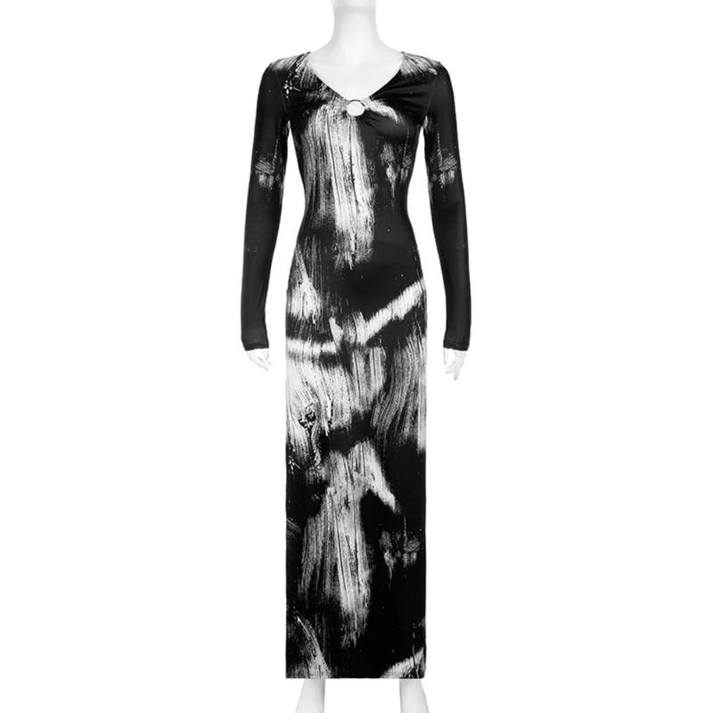 Тонкое ажурное платье с разрезом и принтом, праздничные сексуальные платья макси с v-образным вырезом и длинными рукавами для женщин, осень-весна 2023, женские платья XL чёрный