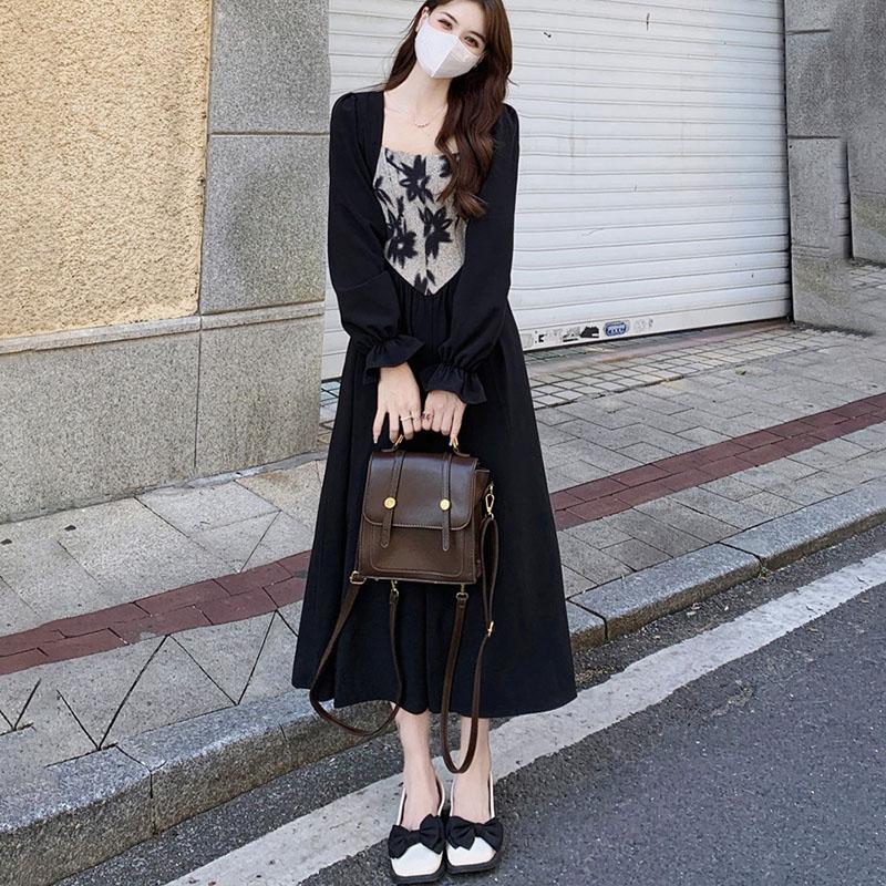 Тонкое платье, осеннее и зимнее, слегка пухлое, длинное платье с высокой талией и смыслом, женское XXXL чёрный