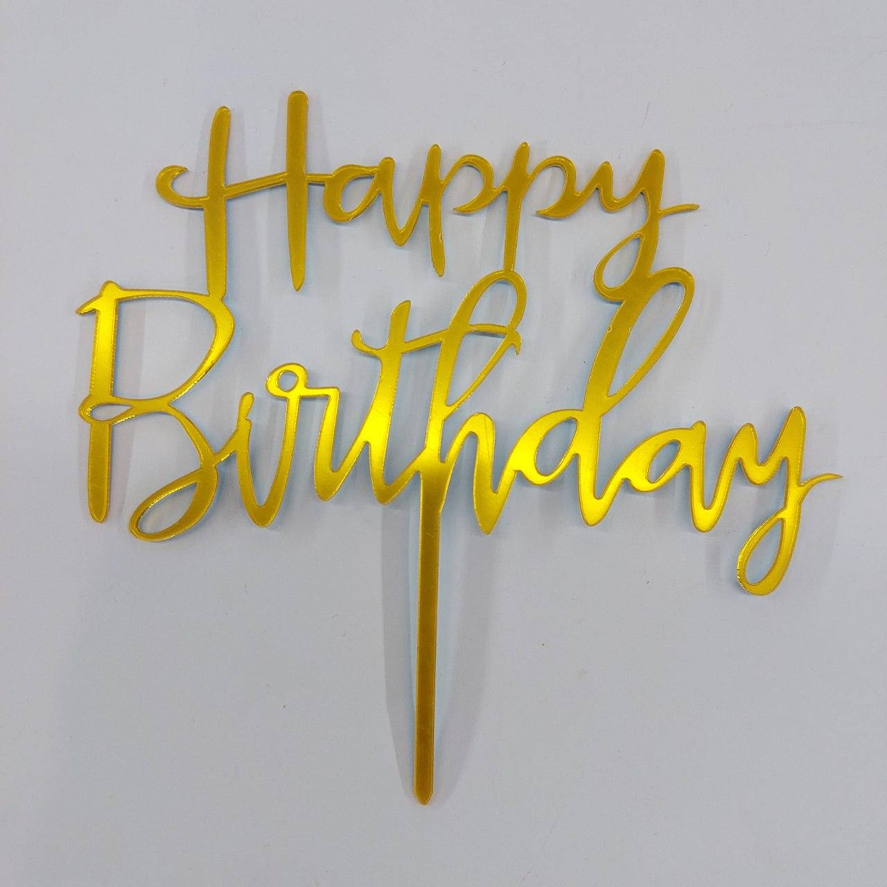Топер в виде надписи Happy birthday цвета золото, который переливается при попадании на него света.