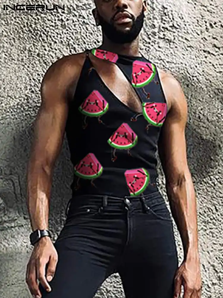 Топы INCERUN, новинка 2022, мужские жилеты, пикантный стильный жилет для отдыха, модные повседневные мужские майки с вырезами и принтом фруктов, м...