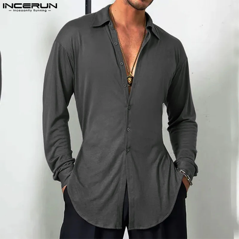 Топы INCERUN 2023, мужские рубашки в американском стиле с завышенной талией, Повседневная хорошо облегающая Мужская однотонная блузка с длинными рукавами и лацканами, Женская