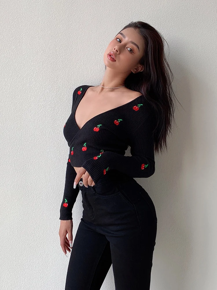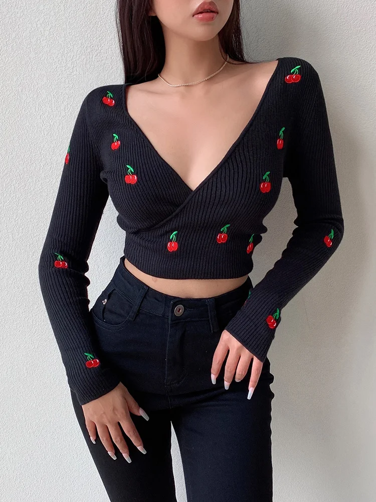 Топ женский трикотажный короткий с V-образным вырезом и длинным рукавом
