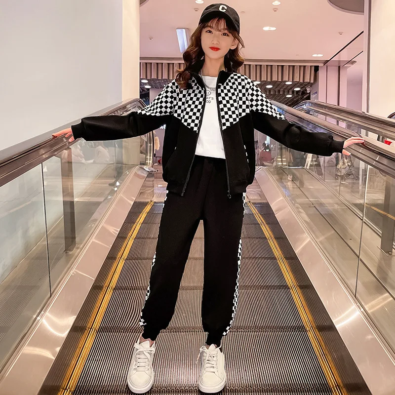 Fashion Teenage Tracksuits Street Clothes Plaid Coat & Pants Kids Sports Suits Children Girls Spring Outfits 4 5 6 8 11 12 14 Y