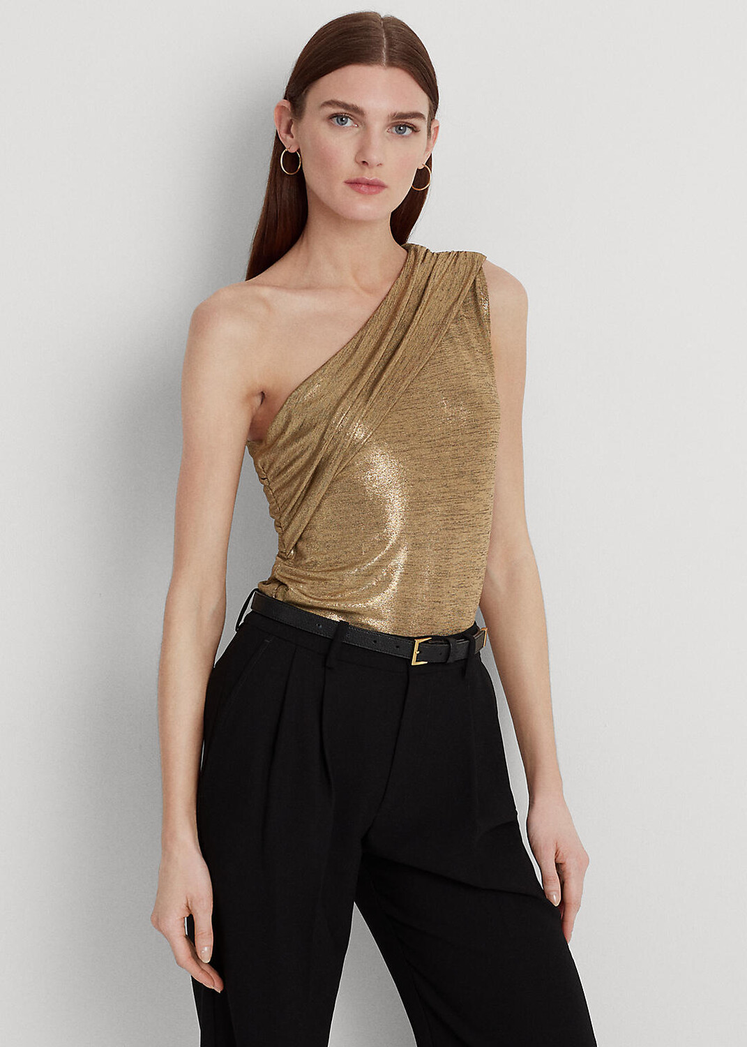 Силуэт этого облегающего топа с одним плечом выполнен из эластичного трикотажа с фольгированным принтом, придающего металлическому блеску и мягкости. Источая современный гламур, он украшен вышитым фирменным логотипом Лорен на кромке.