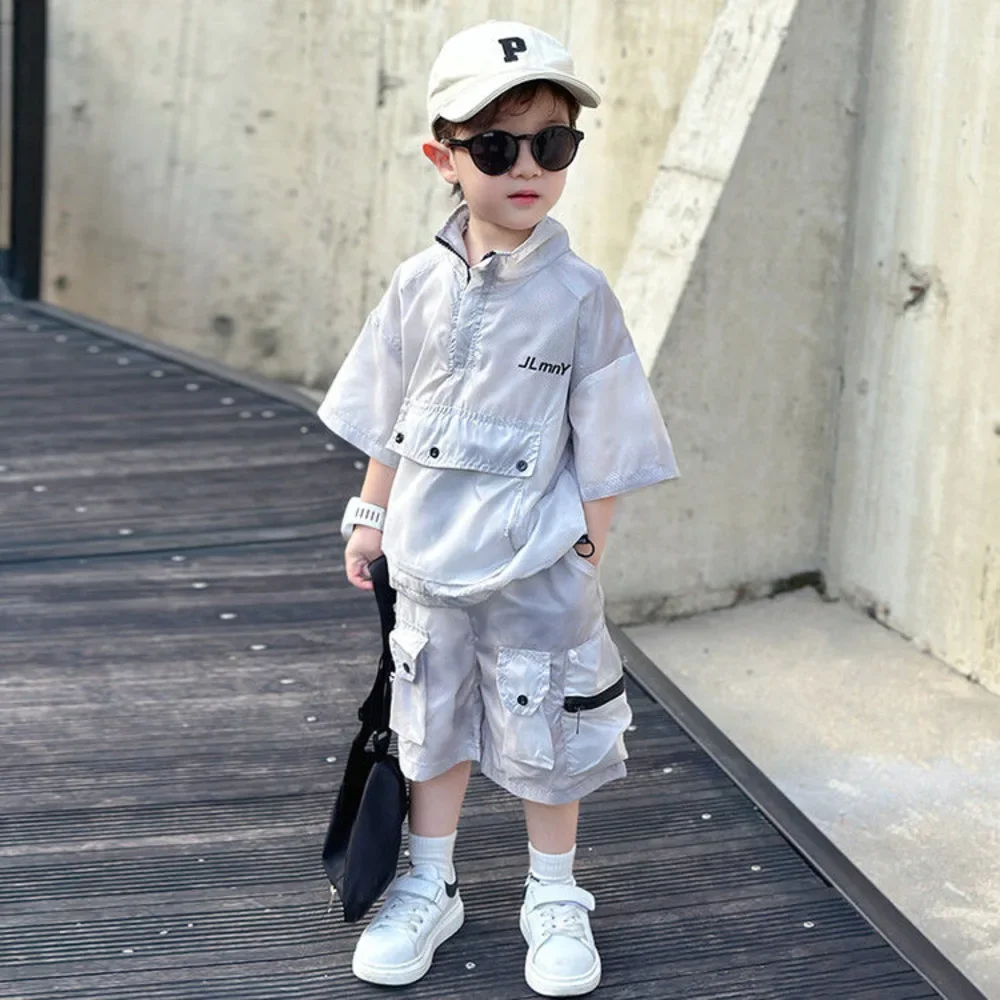Топ и шорты для мальчиков, комплект из двух предметов, летняя уличная одежда в Корейском стиле, детская легкая тонкая рабочая одежда в стиле хип-хоп, красивый костюм