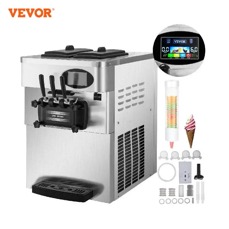 Торговый автомат для производства мягкого мороженого VEVOR 20-28 л/ч, триколор, 2 + 1 аромата, сладкие конусы, замораживающее оборудование, торговы...