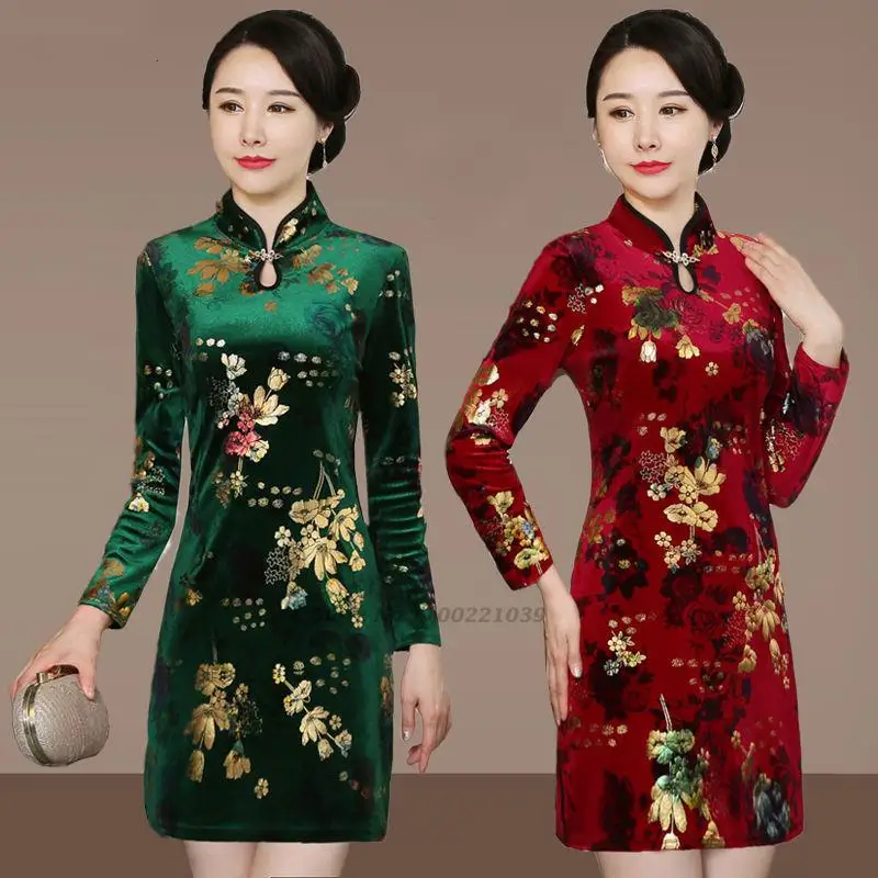 Традиционное китайское бархатное платье-Ципао с цветочным принтом, вечернее праздничное платье в восточном стиле, 2023
